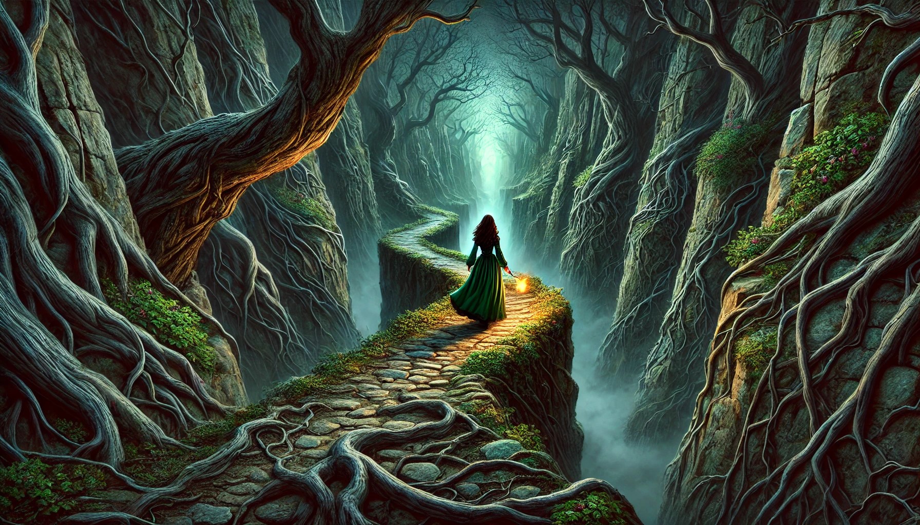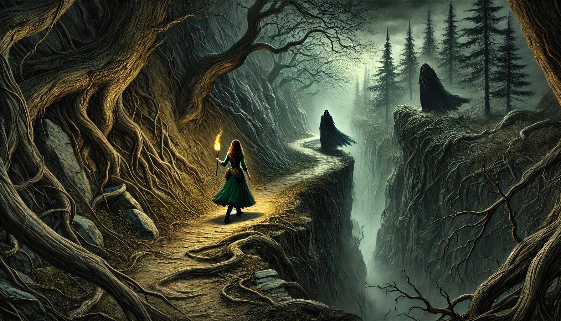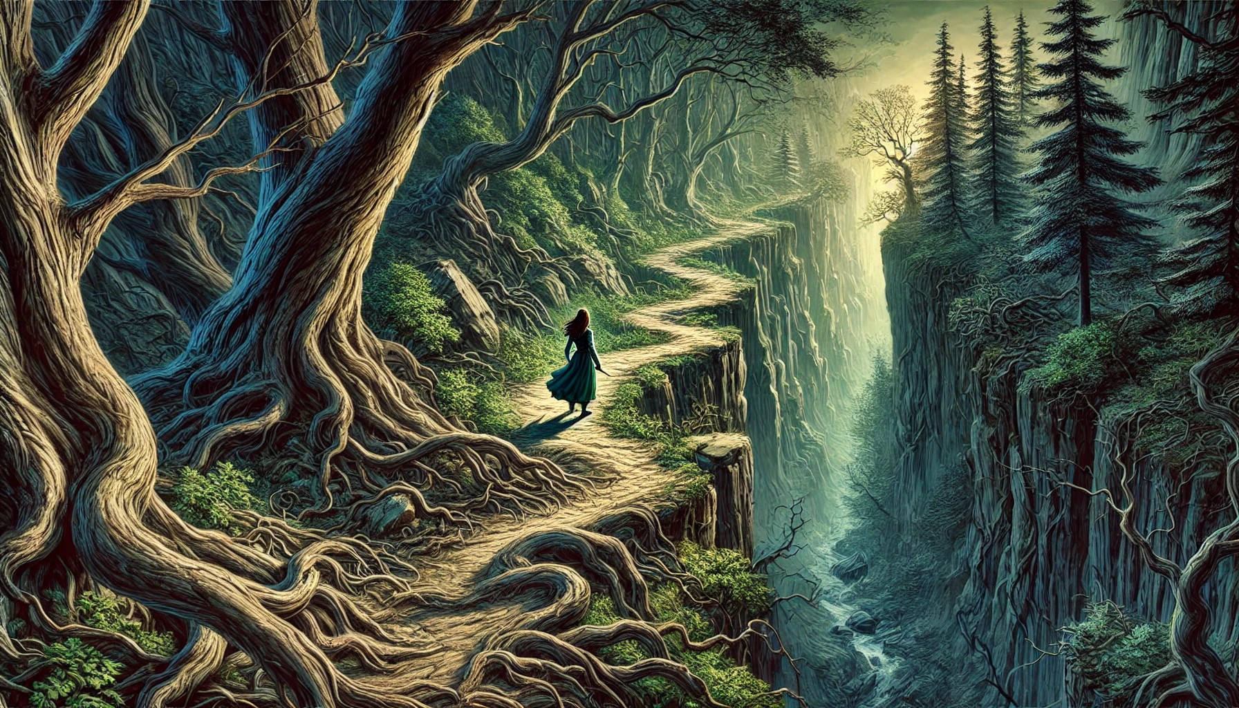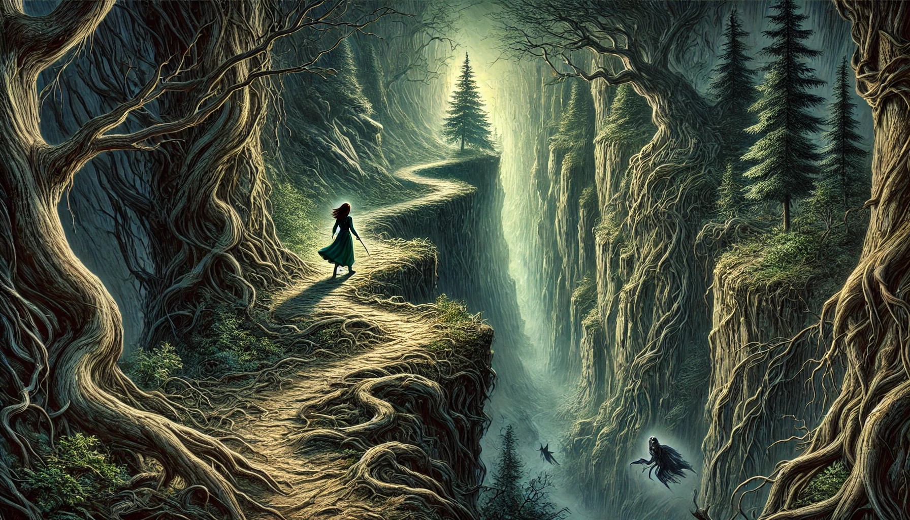 Al caminar unos minutos, siente una rara sensación, como la que experimentó en el bosque antiguo con las dríadas; se siente observada. De inmediato, siente mucho temor y la sensación de que algo está mal, se siente fuera de lugar, y por primera vez, recibe una dosis de realidad. Quiere regresar, pero al pensar en Reynard, que está muriendo, encuentra fuerzas y sigue caminando por aquel sendero, esperando que termine pronto para llegar a la montaña.