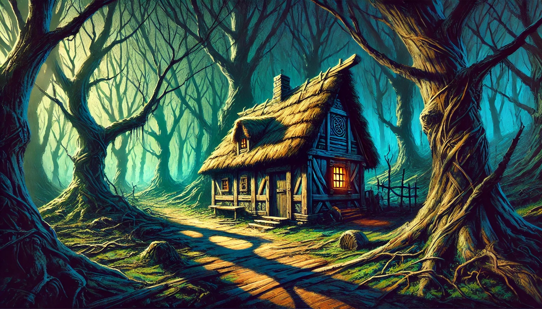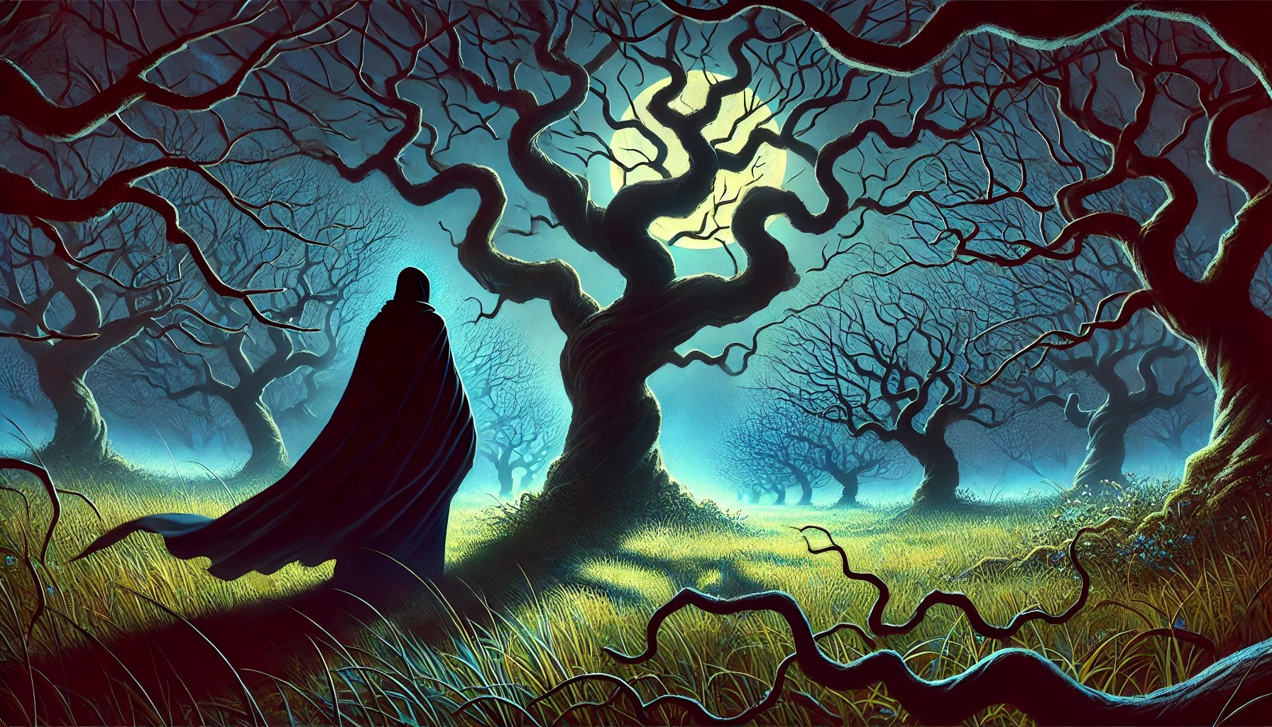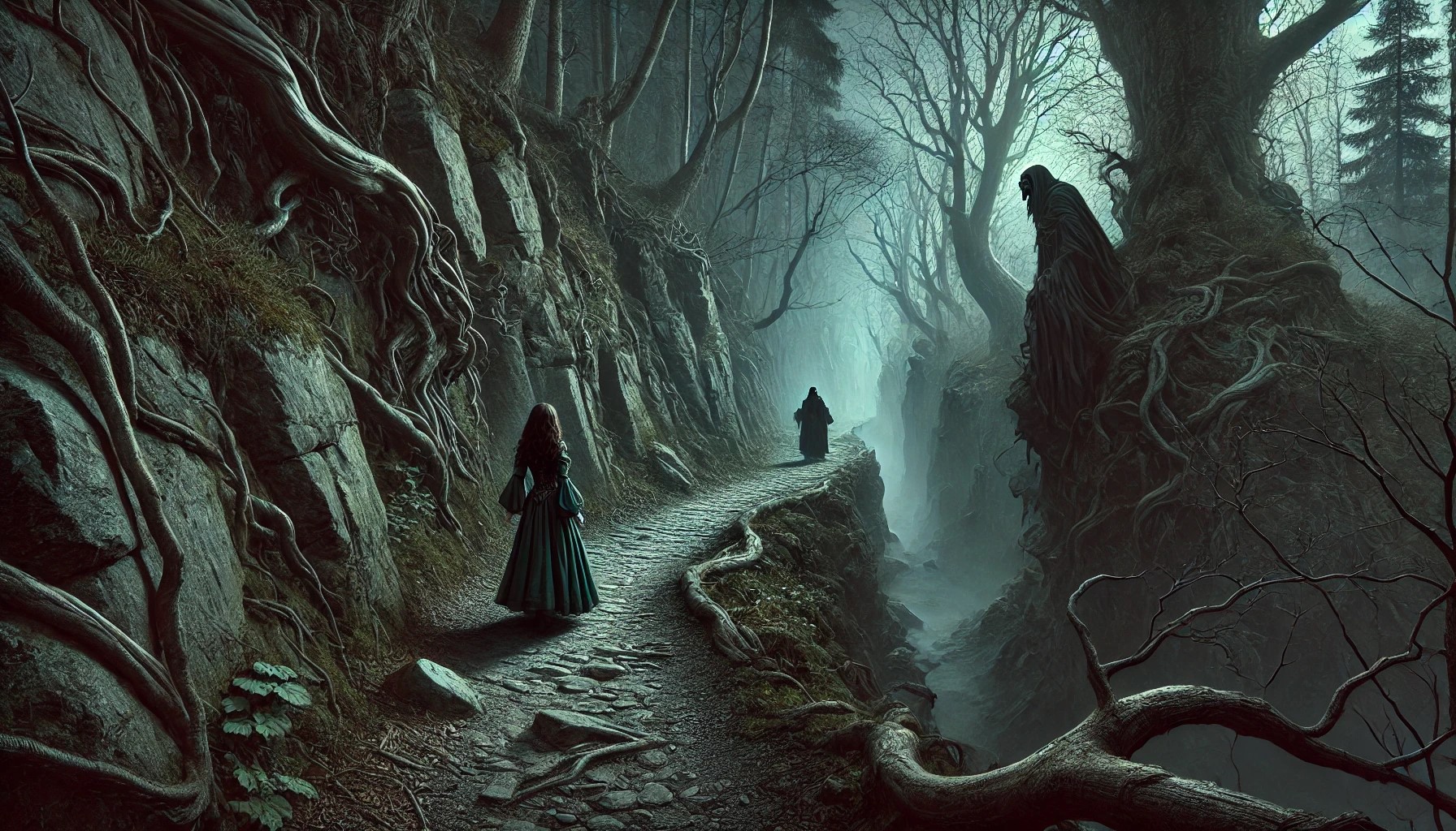 Helen entra al bosque oscuro y de inmediato comprende por qué lo llaman así: casi no entra la luz del sol por alguna razón, y los árboles casi no tienen vegetación. No pasó mucho tiempo antes de que encontrara tres senderos que convergen en el mismo punto. Uno se pierde en el centro del bosque oscuro, otro se extiende hacia la izquierda y otro hacia la derecha. Helen no sabe cuál de ellos la llevará a su destino, así que elige el sendero del centro, para no desviarse mucho de su camino.