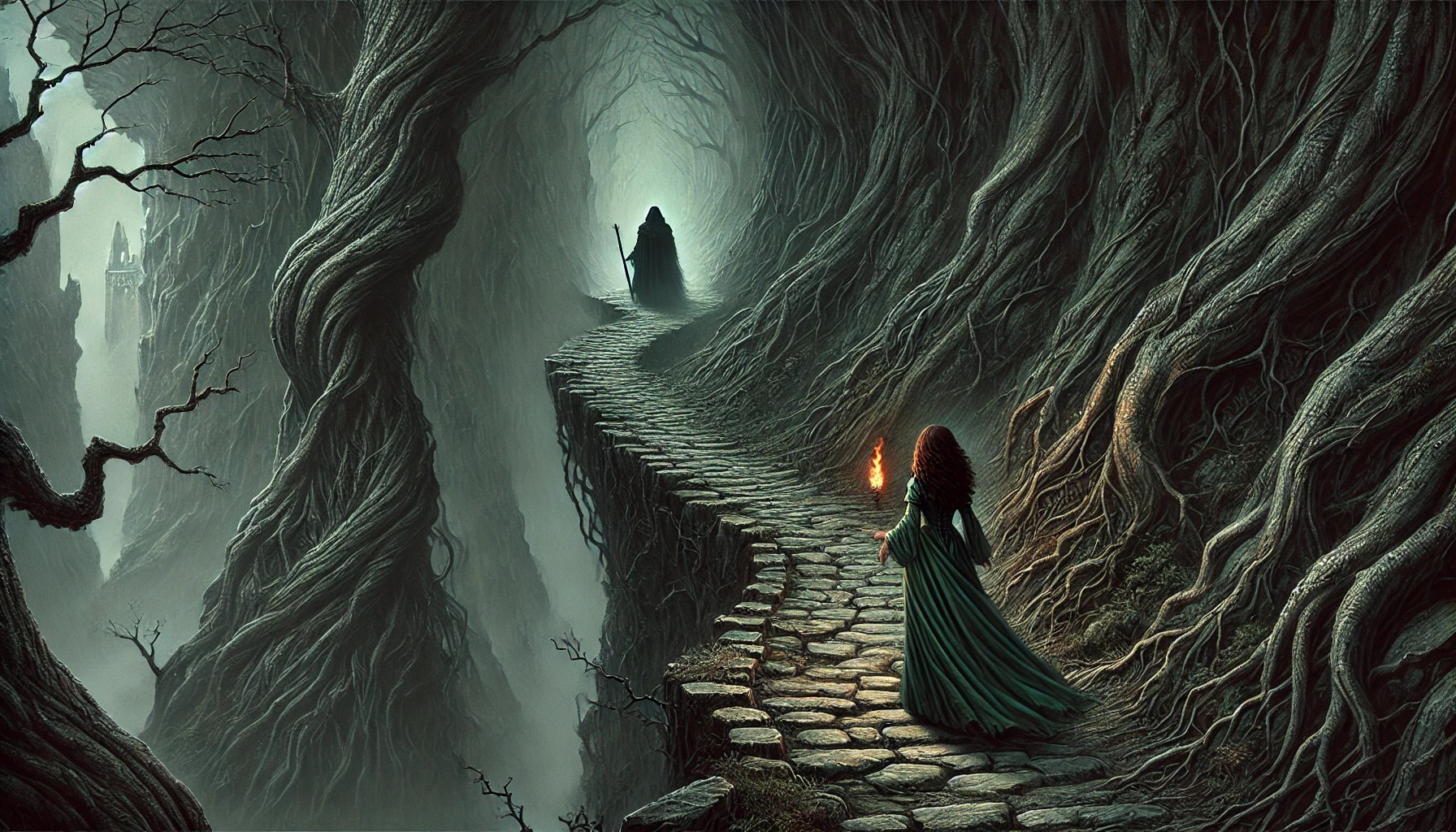 A lo lejos, logra ver la silueta del monje, como si la estuviera esperando en algún lugar. Debido a su antorcha, solo puede ver lo que está muy cerca de ella y no logra distinguir con claridad a la distancia, por lo que decide deshacerse de la misma.