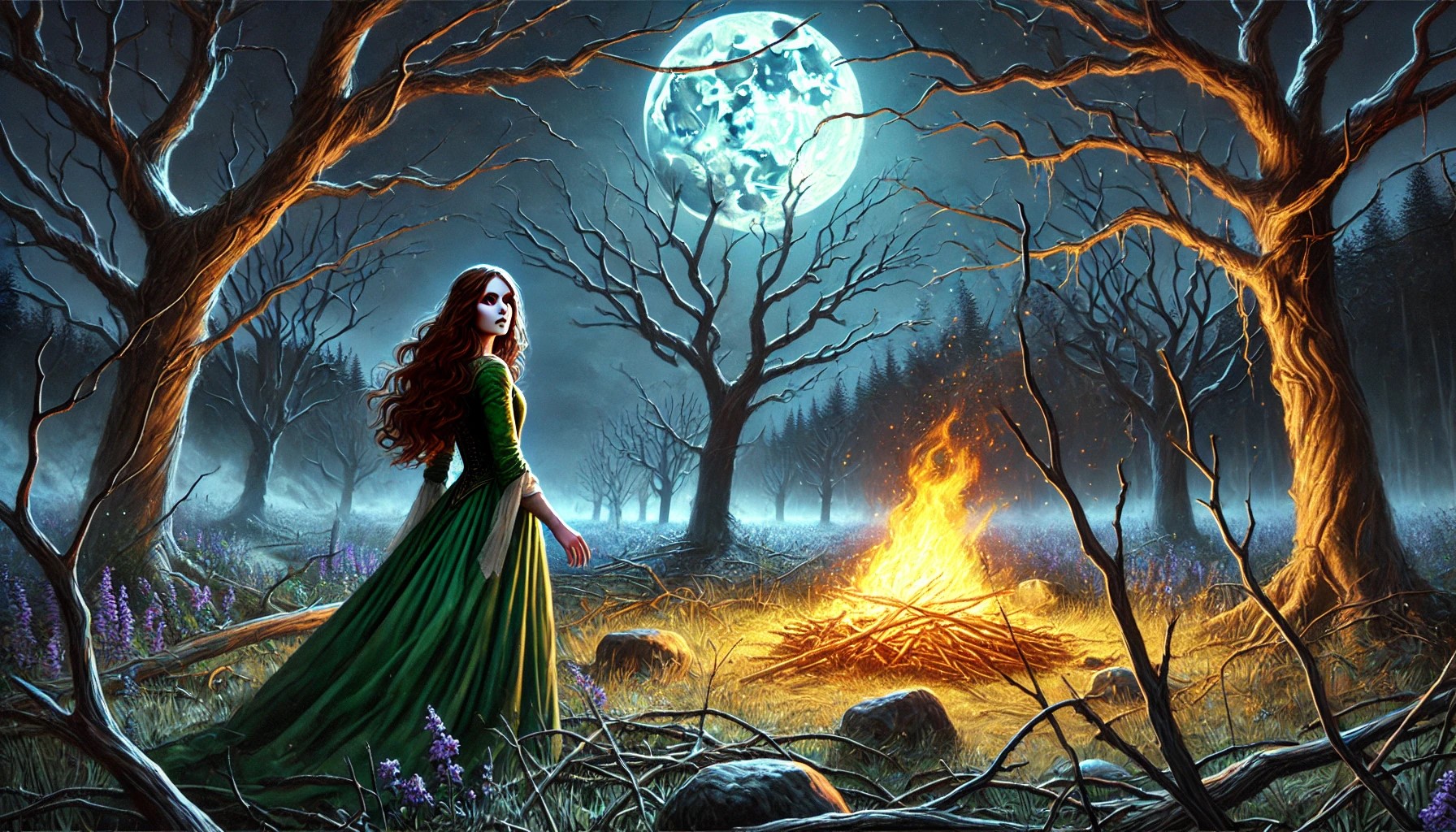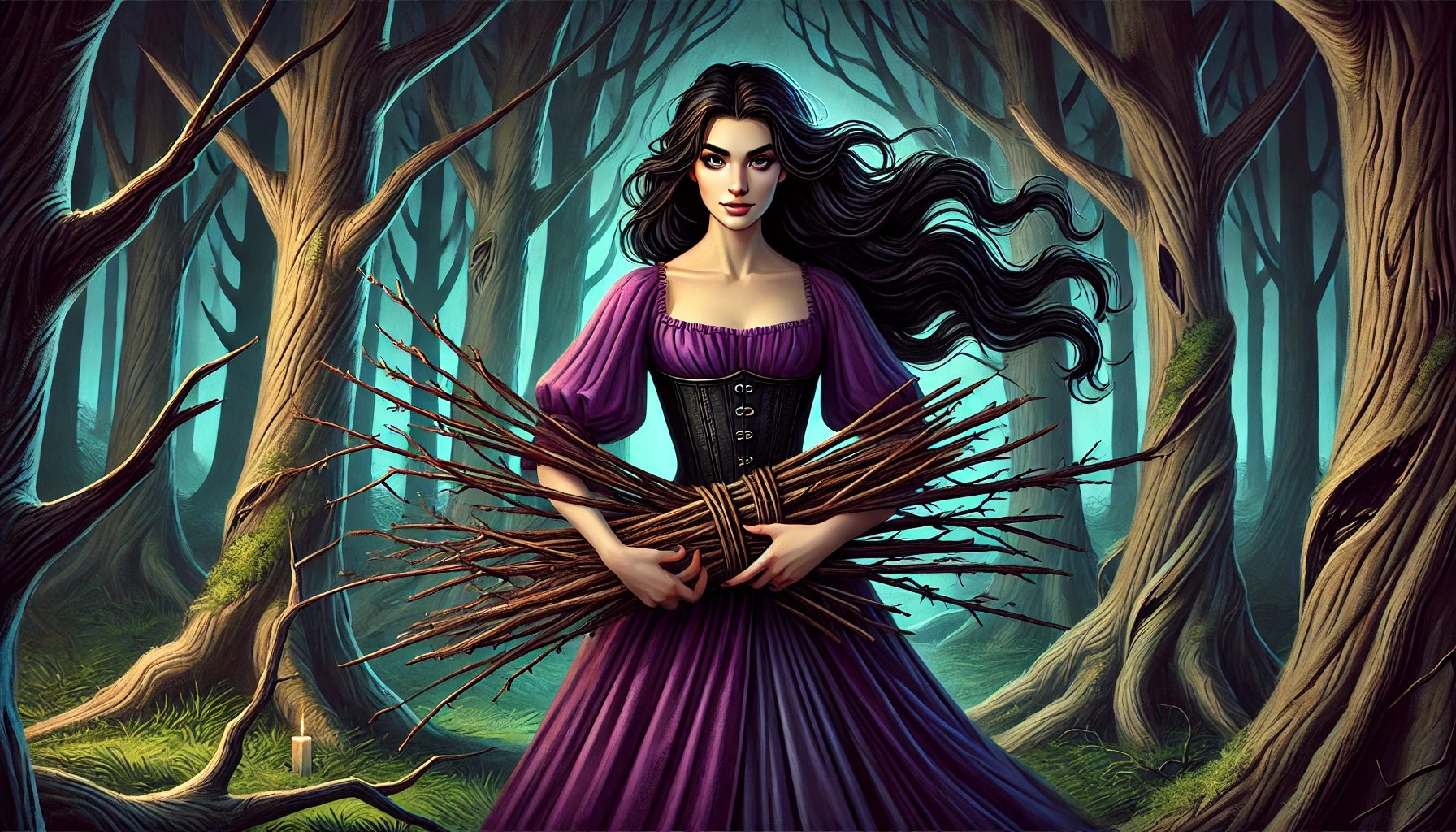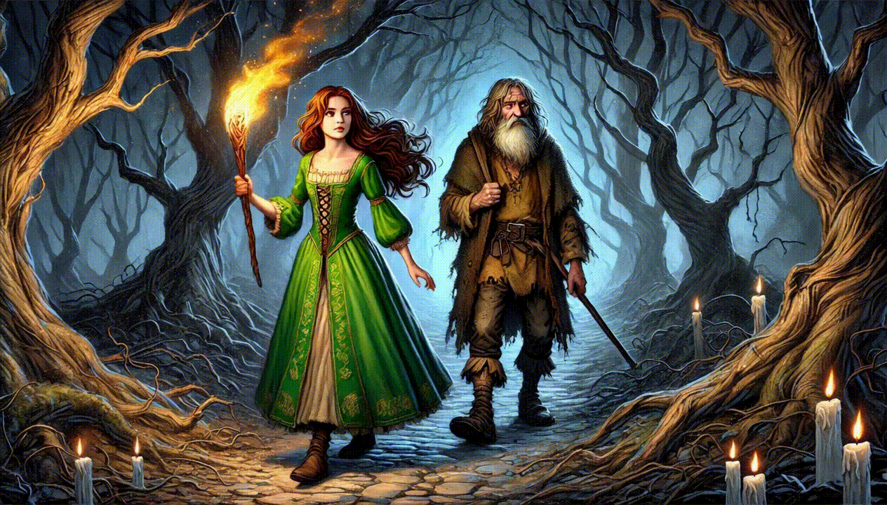 Después de unos minutos más de caminar cuidadosamente, Helen logra ver a un costado del sendero a una mujer hermosa que está recogiendo leña. Algo no encaja bien; lucía muy bella con un vestido elegante, lo cual no concordaba con una recolectora de leña. Helen recuerda de inmediato todos los consejos que recibió de las dríadas.
